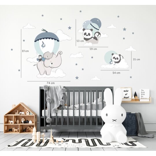 Elefánt, panda, pingvin hőlégballonban, kék-menta falmatrica gyerekszobába
