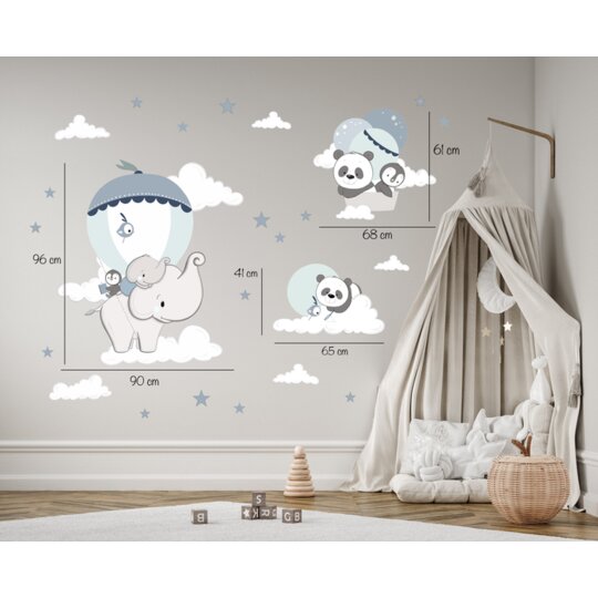 Elefánt, panda, pingvin hőlégballonban, kék-menta falmatrica gyerekszobába, óriás méret